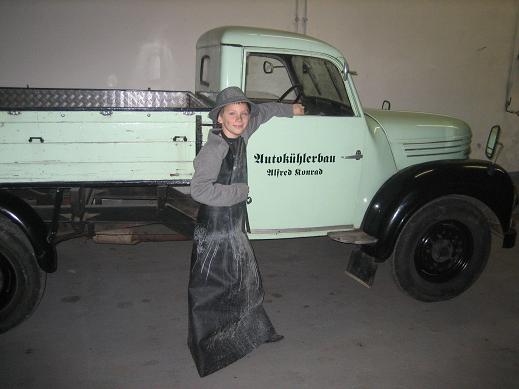 Kühler Konrad Mein Enkel steht vor dem alten Framo. So ähnlich habe ich damals begonnen und meinem Vater bei der Reparatur von Kühlern geholfen. |